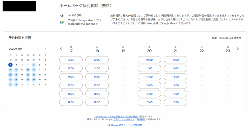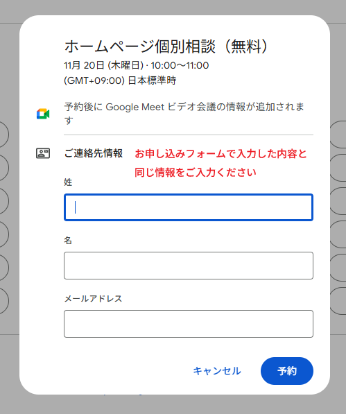 【当日】リマインダーメールが届く「予約が完了しました: ホームページ個別相談(無料)」内にある「Google Meetに参加する」から会議を開始する