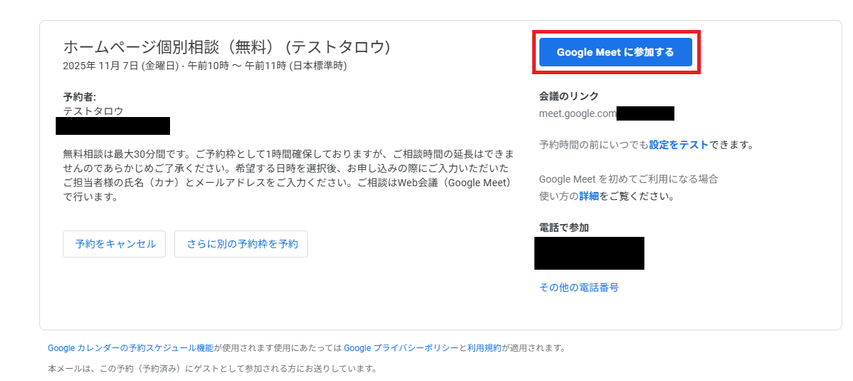 【当日】リマインダーメールが届く「予約が完了しました: ホームページ個別相談(無料)」内にある「Google Meetに参加する」から会議を開始する