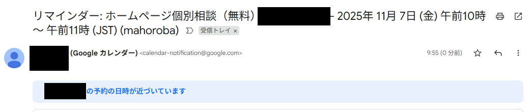 「予約が完了しました: ホームページ個別相談(無料)」という自動返信メールが届く